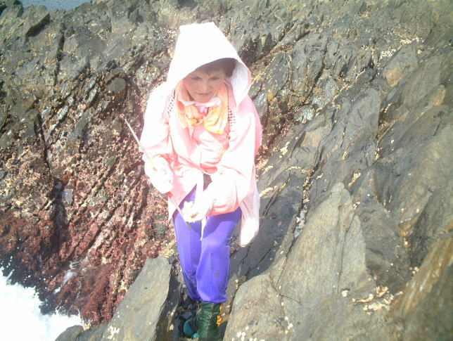 腰にぶら下げた袋の中にイッパイの貝です。 トコブシ・カメノテ・蟹・・・いろいろです。