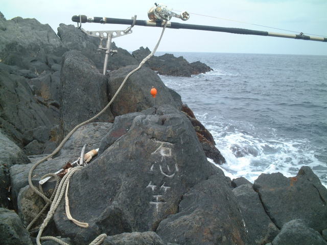 ポイントの岩に石心竿の名が刻印されています。 その先にピトンをセットして沖合の洗磯