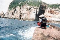 手持ちで石鯛に誘いをかける、ジローの釣りスタイル。